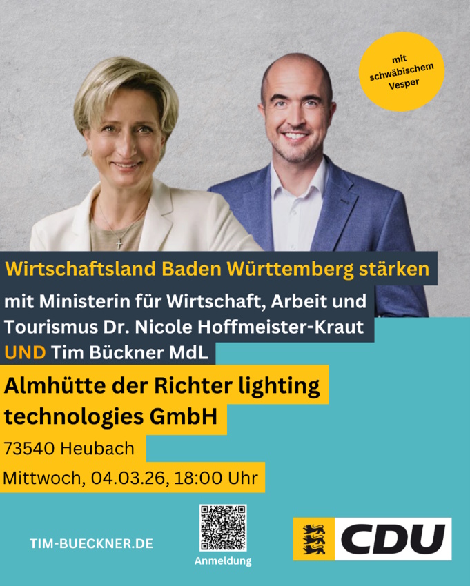Daher freut es mich ganz besonders, Sie und Euch zu unserem Wirtschaftstalk mit der Ministerin für Wirtschaft, Arbeit und Tourismus Dr. Nicole Hoffmeister-Kraut am Mittwoch, den 04. März 2026 um 18:00 Uhr in die Almhütte der Firma Richter lighting (Im Morgen 1, 73540 Heubach) einladen zu dürfen.