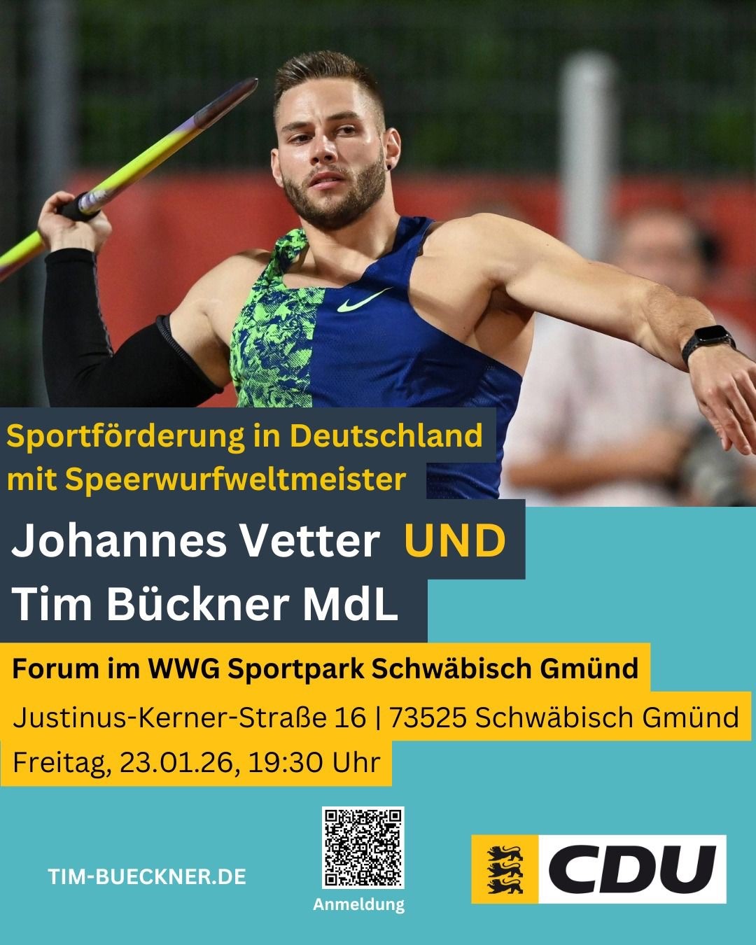 Am Freitag, 23. Januar 2026, um 19.30 Uhr lade ich Sie und Euch herzlich zum Diskussionsabend zum Thema „Sportförderung in Deutschland“ ins Forum im WWG Sportpark in der Justinus-Kerner-Straße 16 in Schwäbisch Gmünd ein. Als besonderen Gast darf ich den Speerwurfweltmeister Johannes Vetter begrüßen. Zudem tritt er als Zweitkandidat der CDU-Ministerin Marion Gentges MdL im Wahlkreis Lahr an.