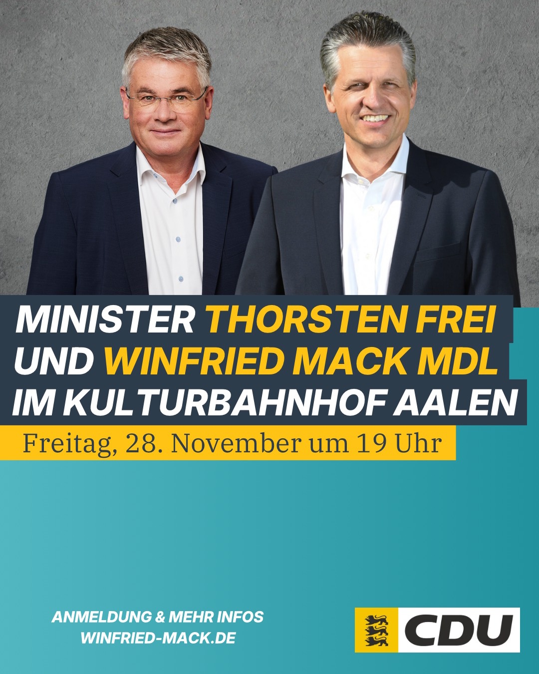 Ihr gemeinsames Ziel ist es Baden-Württemberg weiter zu stärken und so unseren Beitrag zu einem zukunftsfähigen, stabilen und erfolgreichen Deutschland zu leisten. In bewegten Zeiten braucht es Orientierung, Sachverstand und klare Werte – genau dafür steht unsere CDU – stehen auch Thorsten Frei und Winfried Mack.