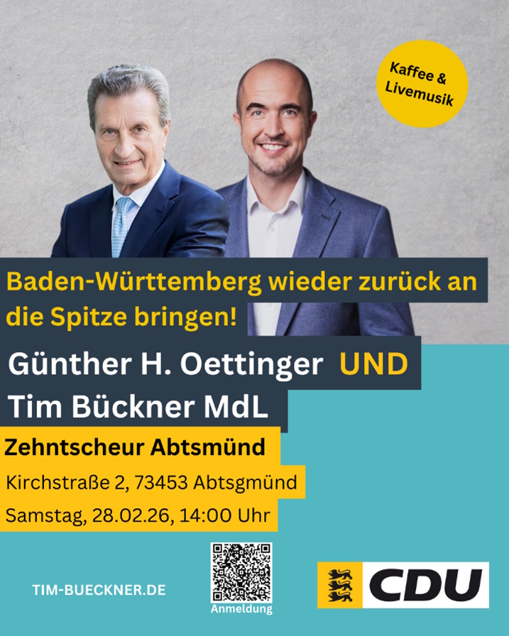 Mir ist es daher eine ganz besondere Freude zum Wahlkampfendspurt am Samstag, den 28.02.26 um 14:00 Uhr in die Zehntscheuer Abtsgmünd (Kirchstraße 2, 73453 Abtsgmünd) Günter H. Oettinger zum Thema „Baden-Württemberg wieder an die Spitze bringen“ begrüßen zu dürfen.
