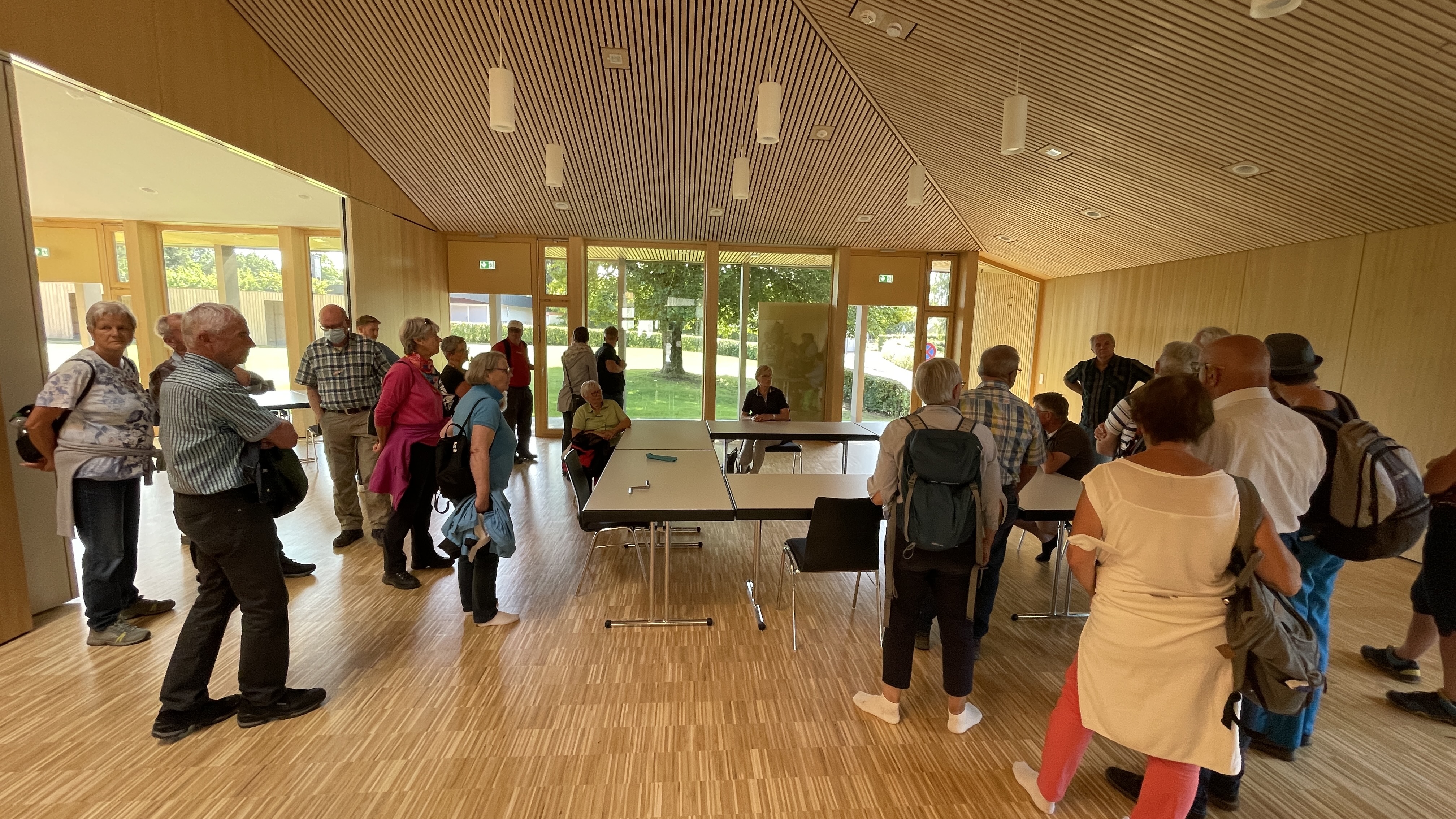 Abenteuerlich wanderten wir mitten durch den Wald zurück nach Fachsenfeld und besichtigten dort mit Hubert Schneider und Dieter Oschwald das architektonisch sehr gelungene Gemeindezentrum. Ein großes Lob an den Kirchengemeinderat, der dieses Projekt gestemmt und absolut durchdacht geplant hat. Eine große Bereicherung für Fachsenfeld!