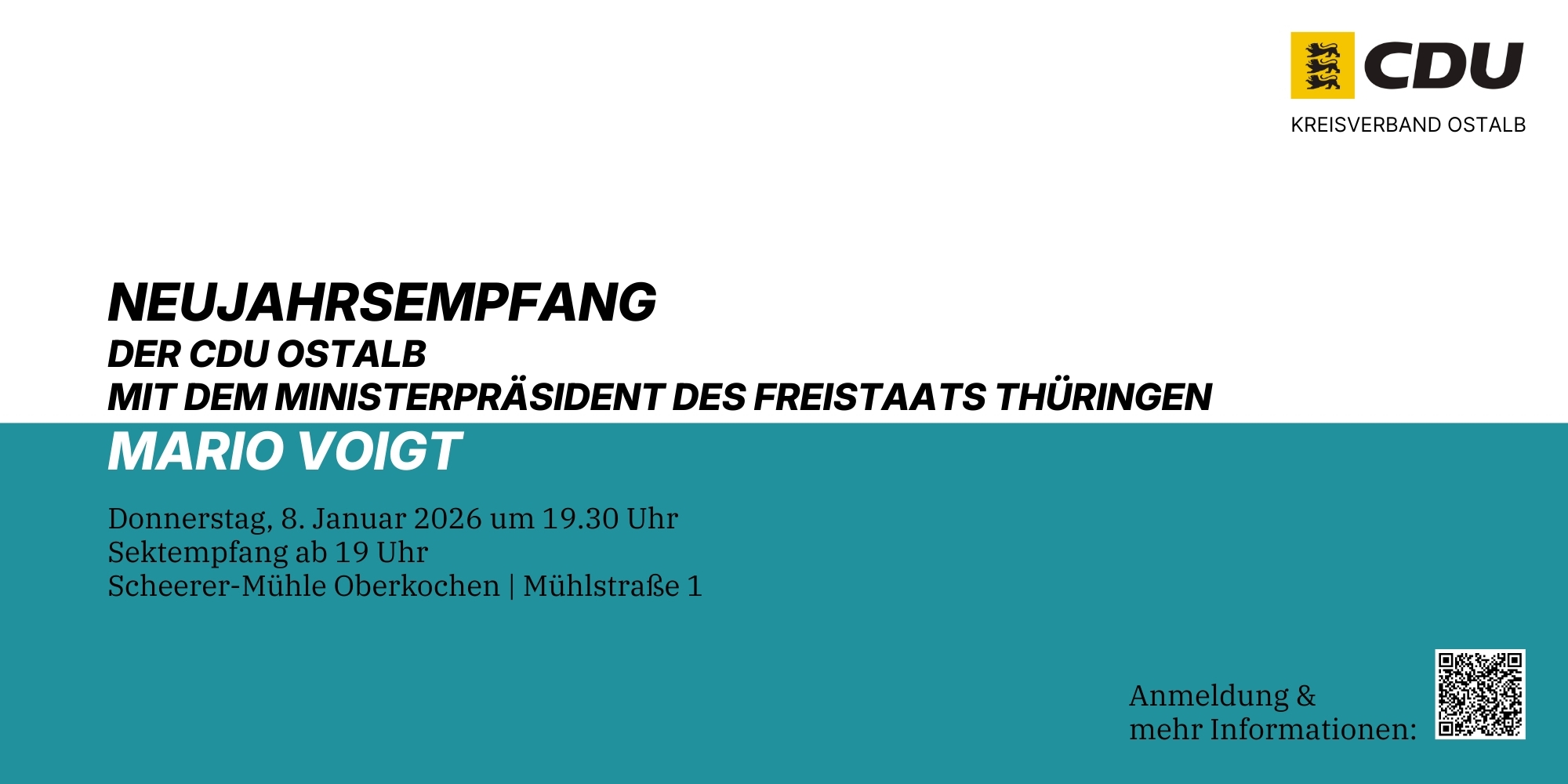 Herzliche Einladung zum Neujahrsempfang der CDU Ostalb zu dem wir am 8. Januar 2026 Mario Voigt, Ministerpräsident des Freistaats Thüringen, in der Scheerer-Mühle in Oberkochen begrüßen dürfen. Er kommt auf Einladung des Landtagsabgeordneten Winfried Mack in den Ostalbkreis.